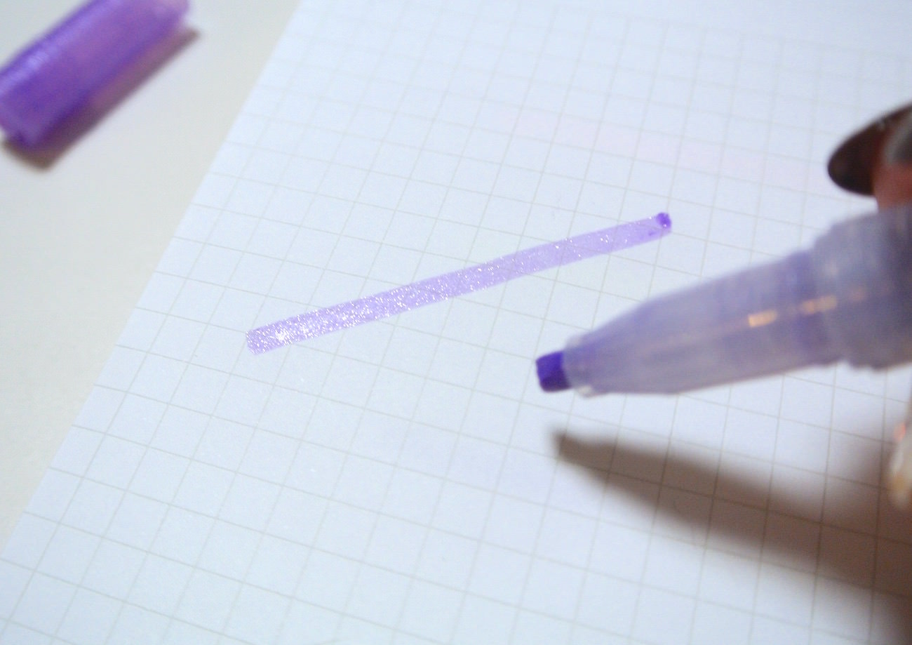 また、「キラリッチ」は従来のラメ入りマーカーと違って使う前にカチャカチャとペンを振らなくてOK。独自に開発した技術でラメが常にインクの中で分散するようになっているため、振ってインクを混ぜなくてもすぐに書き始められるんです。教科書や資料にマーキングしたいとき、サッと使えるので便利ですね。