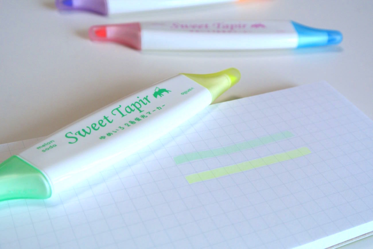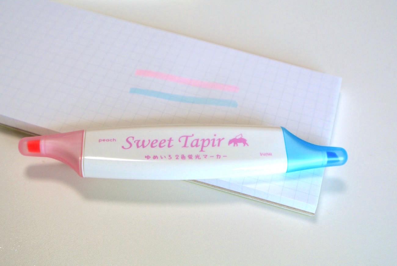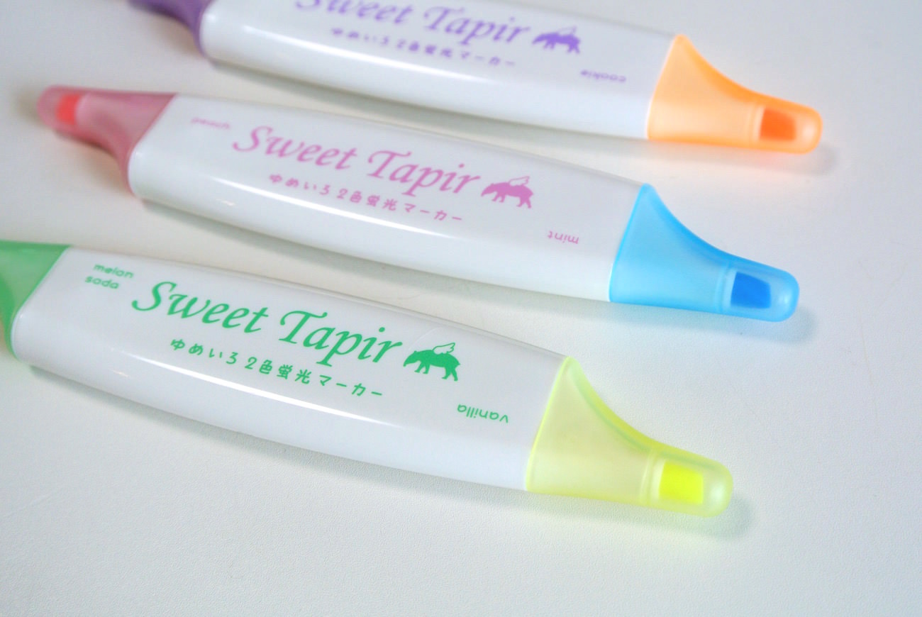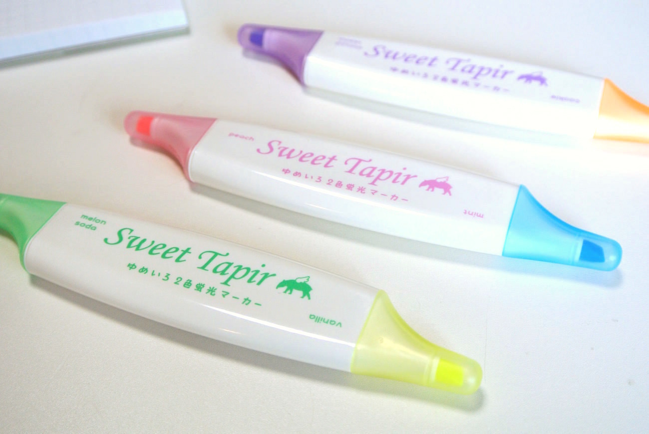 「スゥイートテイパー」は香り付きの蛍光マーカー。普通のマーカーとは違う平べったい形をした、ちょっと珍しい2色マーカーです。