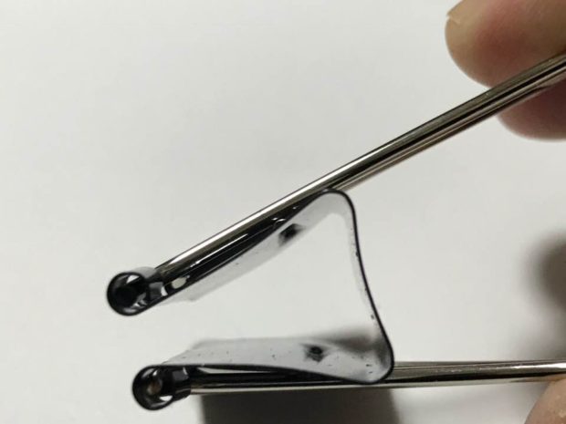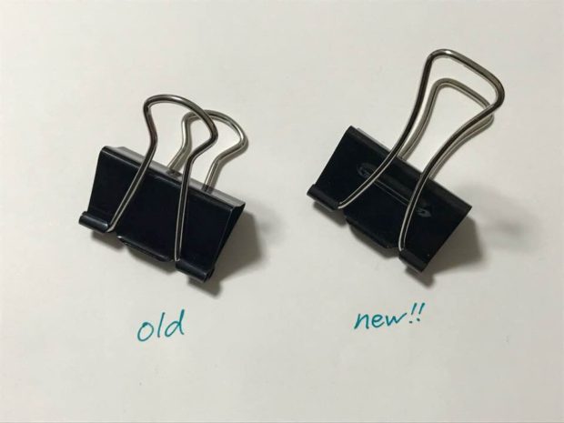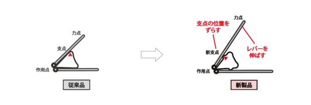 ダブルクリップはもともとテコの原理を使って開け閉めをすることができるのですが、本体部分に小さな突起をつくり「支点」の位置をずらすことで軽い力で開けることができます。