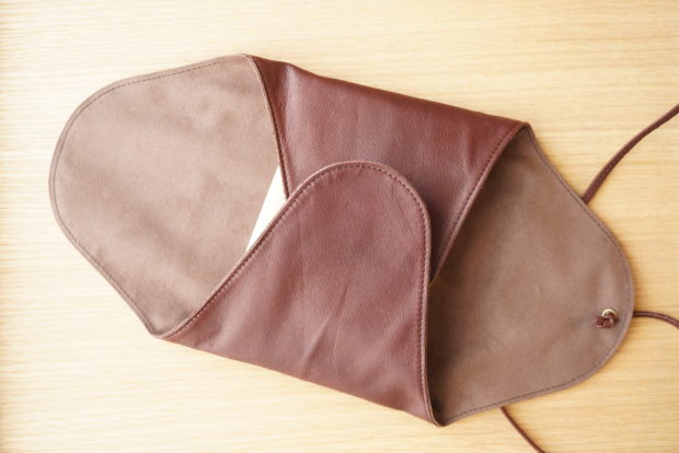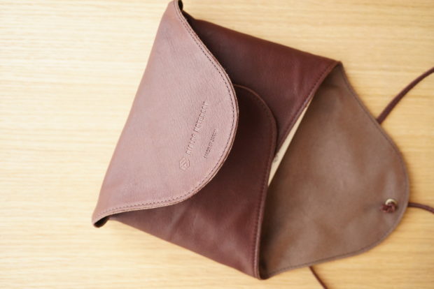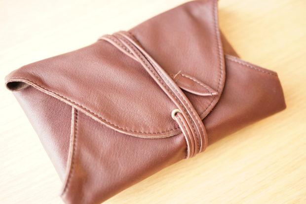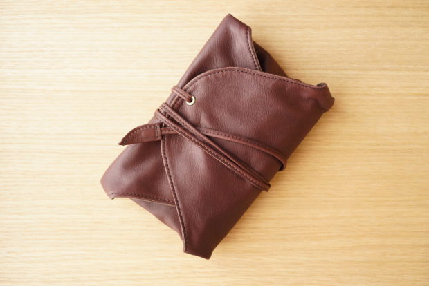 包みやすいように十字型に革を切りましたので、真ん中に包みたいものを置いて、端から畳むだけでかんたんに包むことができます。