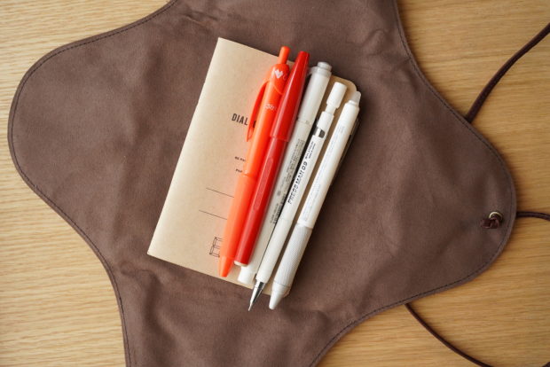 ダイアログノートなどの小さいノートと筆記具を一緒に包んでまとめて持ち運ぶことができます。