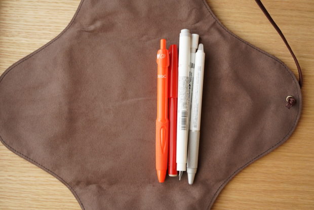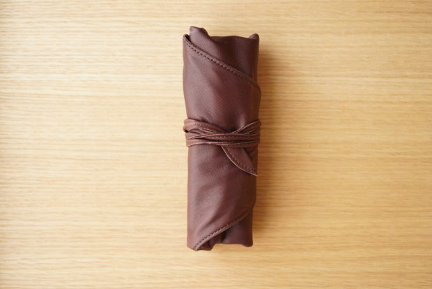 包むものの大きさにあわせて自由に大きさを変えることができるフリーサイズのペンケースなので、たとえば筆記具だけを包むとスリムでコンパクトなペンケースとして使うことができます。