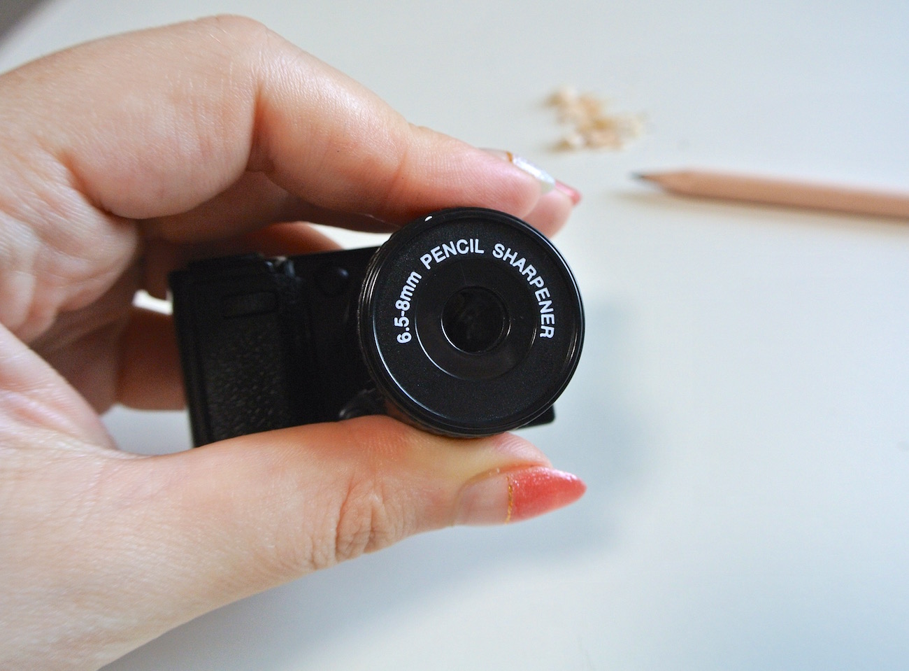 こんなにリーズナブルなのにおしゃれな箱に入っていて、作りも細かく質感もいい。レンズ部分には親切にも「PENCIL SHARPENER」と表記してあります。確かに、置いてあるだけだと鉛筆削りには全く見えません……。