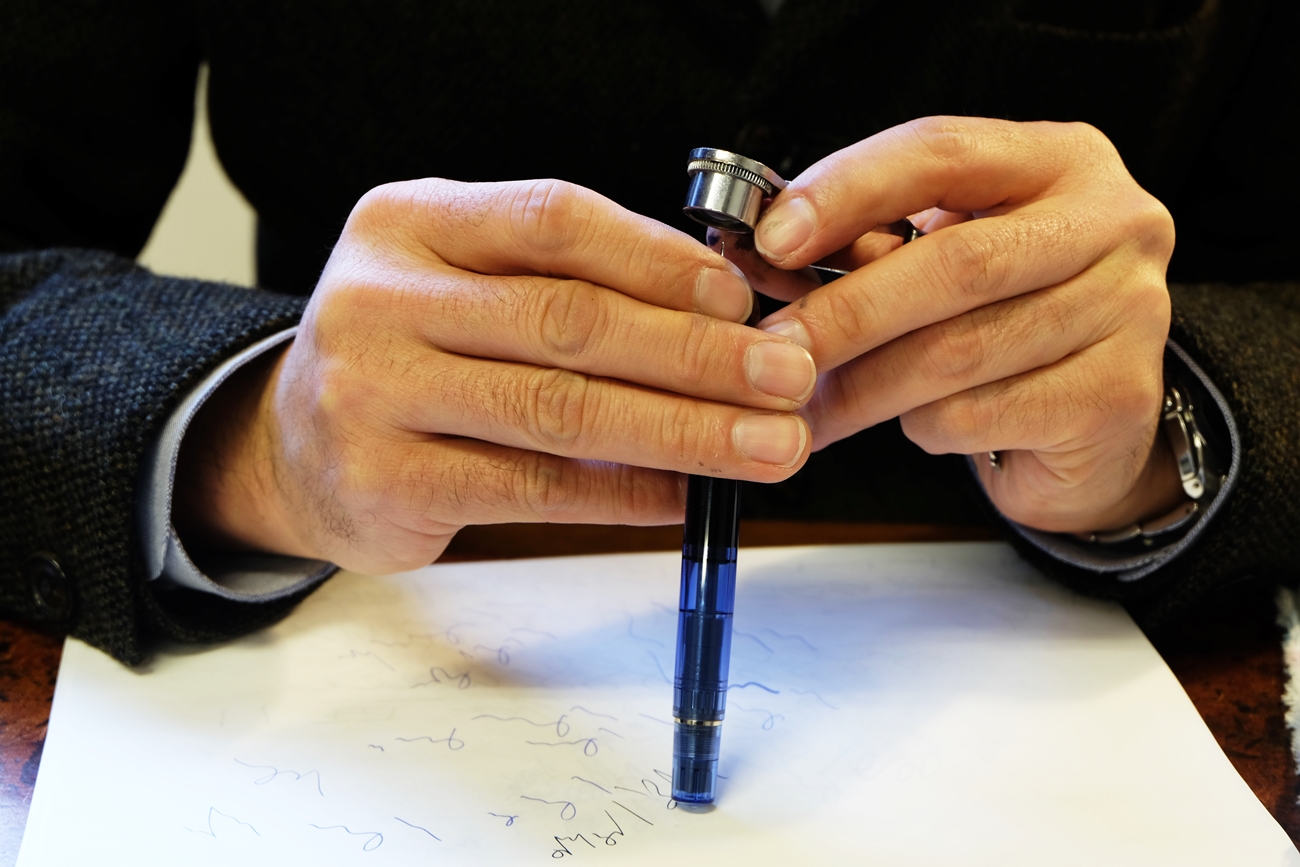 これは初めての経験です。普段のペン選びは試し書きをして、好みに合ったペンを購入したら終わり、あとは持ち帰って使うのみですが、万年筆ではさらに自分の手に馴染ませる工程があるというのです。販売だけでなく、調整もして頂けるお店ならではのとても嬉しいサービスです(こちらのお店では購入時、および購入から1年間は無料 ※内容により費用がかかる場合もあります)。