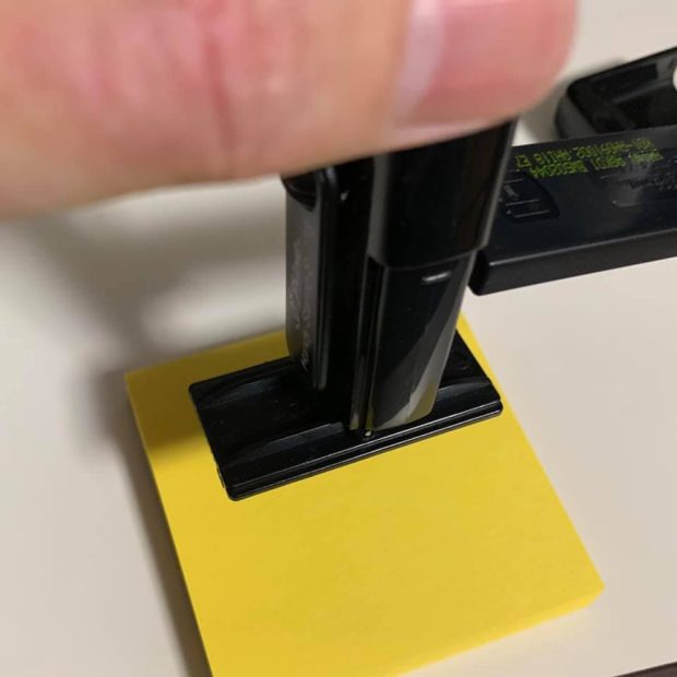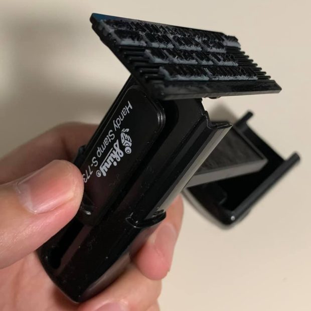 収納時にスタンプパッドが印面にあたっている状態になりますので、取り出したらすぐに押すことができます。