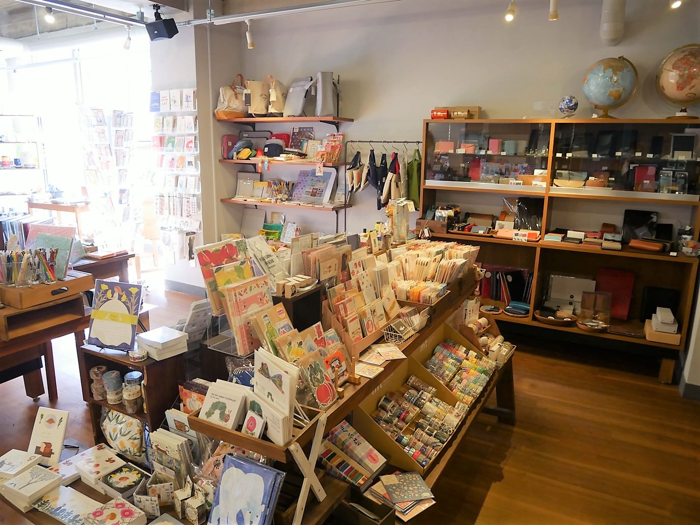 In the bright store with natural light, writing instruments such as fountain pens, ballpoint pens and mechanical pencils, as well as stationery and miscellaneous goods such as notebooks, letter papers and cards are lined up.,ja