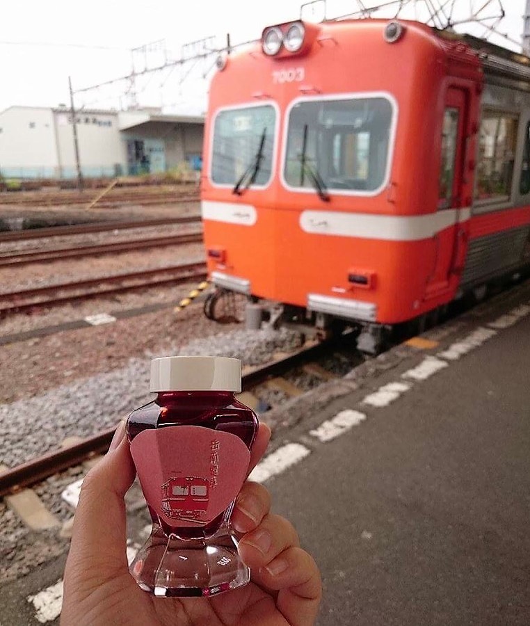 こちらの写真は「Penne19」オリジナルインク「岳南電車」と、実際の電車を一緒におさめた写真です。