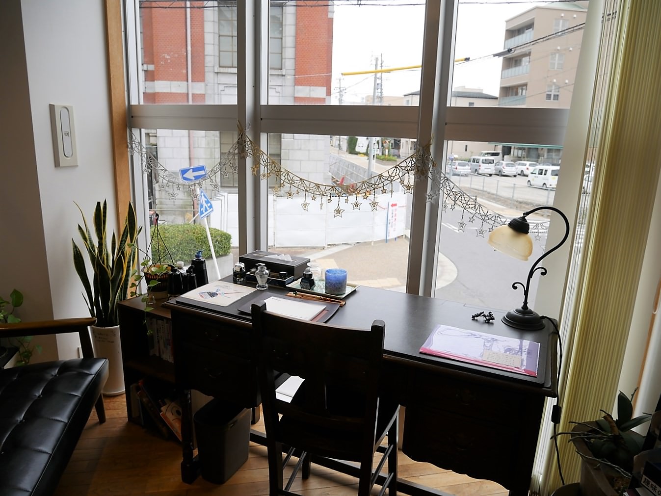 窓際にはゆっくりと試筆ができるライティングデスクもあります。お店にあるほとんどすべての筆記具とインクを試すことができるので、自分にぴったりのアイテムを心ゆくまで探してみてください。