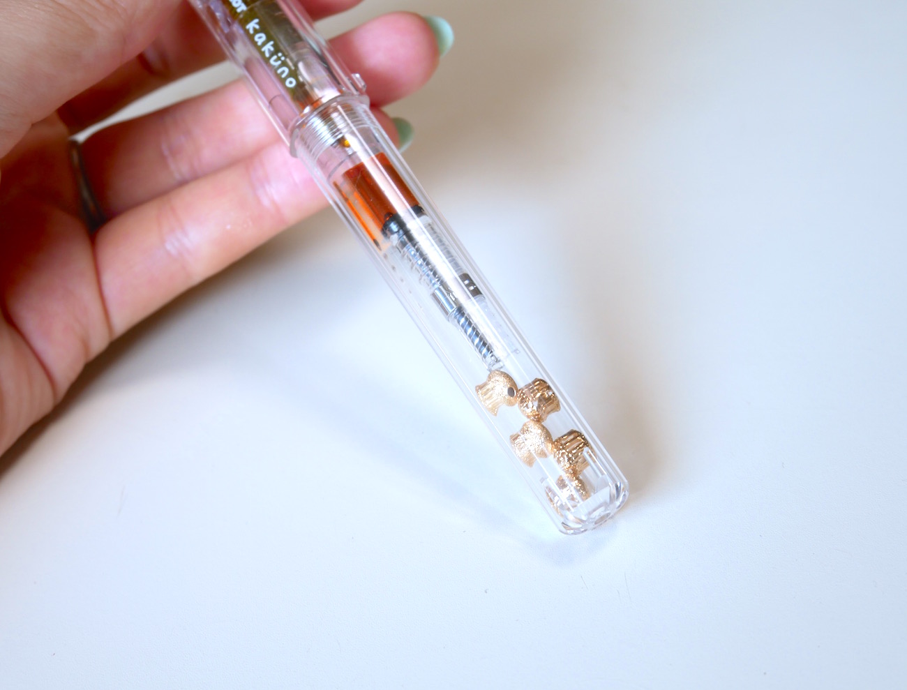 クリアになった「カクノ」は透明度がとても高くて、中に入れたインクがキレイに透けて見えるのが魅力。筆記する時だけでなく、ペンケースに入れているときもインク色の美しさを楽しめるのがいいですね。