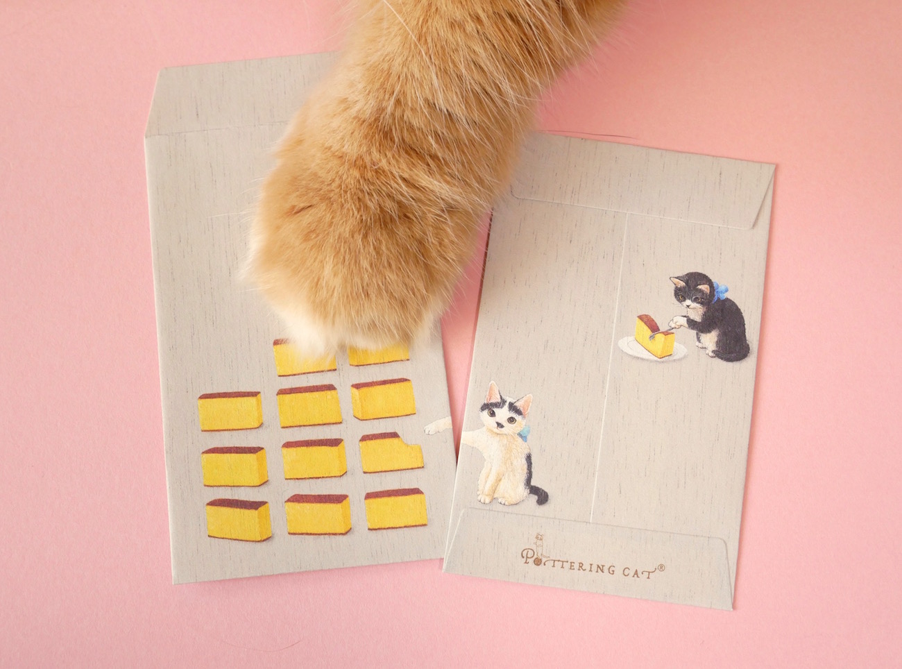表から見ると、いくつものカステラが並んでいるだけに見えますが……、でも右端にはイタズラをするにゃんこのおててが! 裏返すとその正体がわかります。ねこが主張しすぎない、遊び心あるデザインですね。