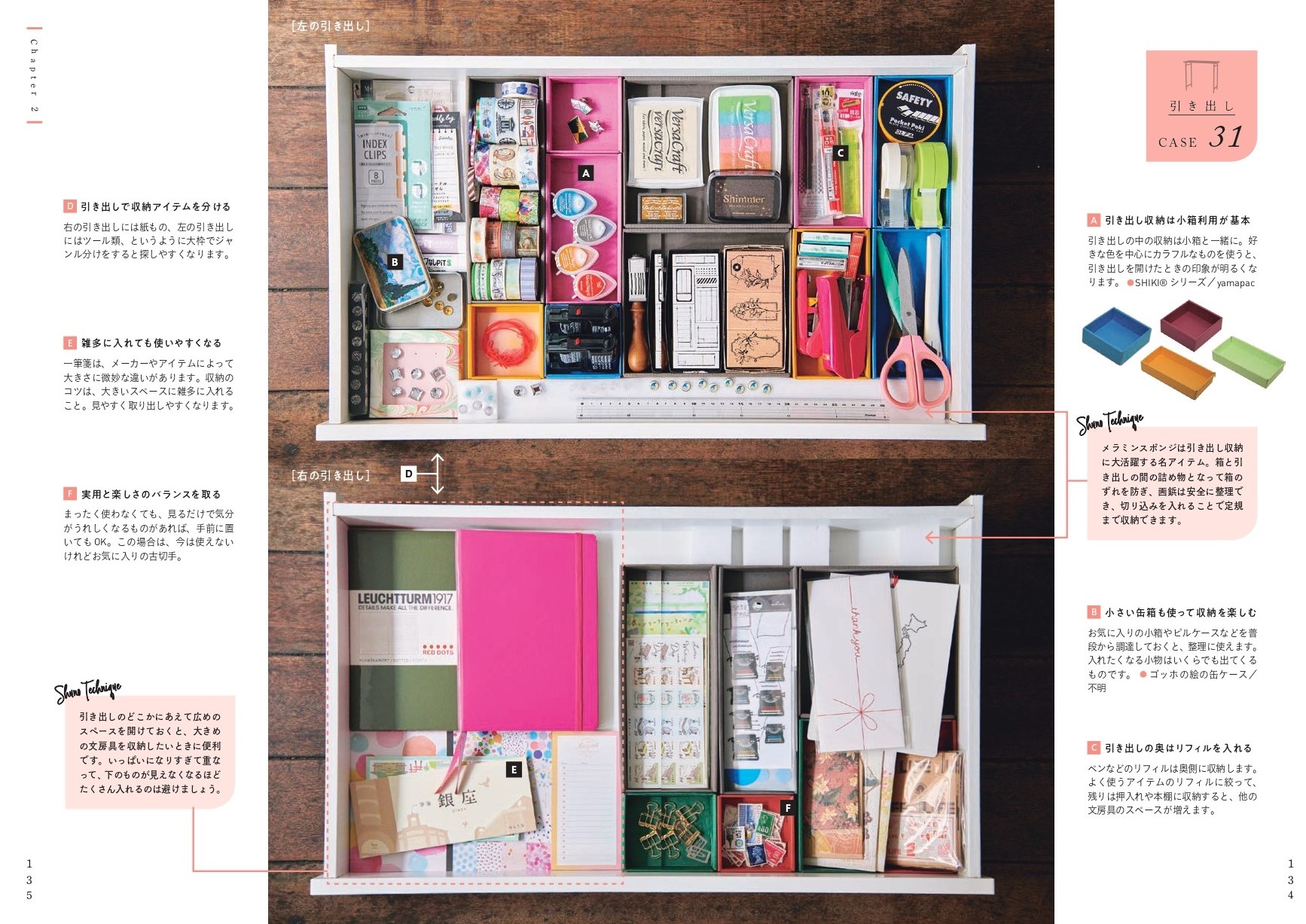 本文では文房具の整理・収納に関する考え方を詳しくご紹介したあと、実際に収納文房具や小箱を利用して、写真とともに具体例をご紹介しています。