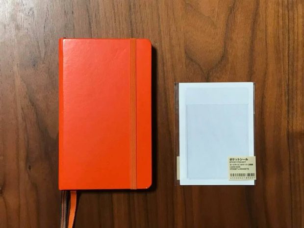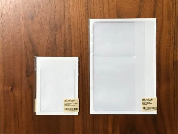こちらが無印良品のポケットシール。裏が粘着シールになっていて、カードサイズとハガキサイズの2つのサイズがあります。