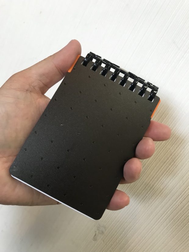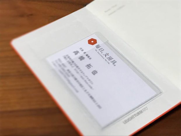 私は毎日持ち歩いているポケットサイズのノート「ロイヒトトゥルム」に貼り付けて、非常用の名刺入れとして使っています。急な名刺交換でも安心。