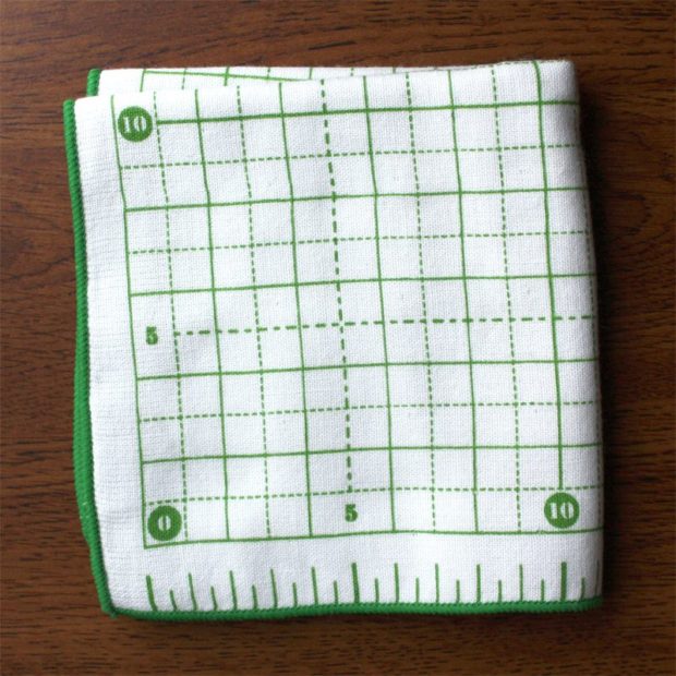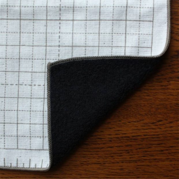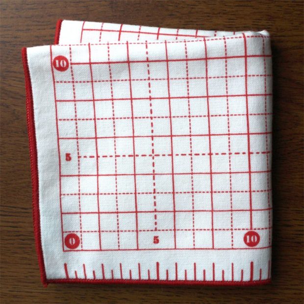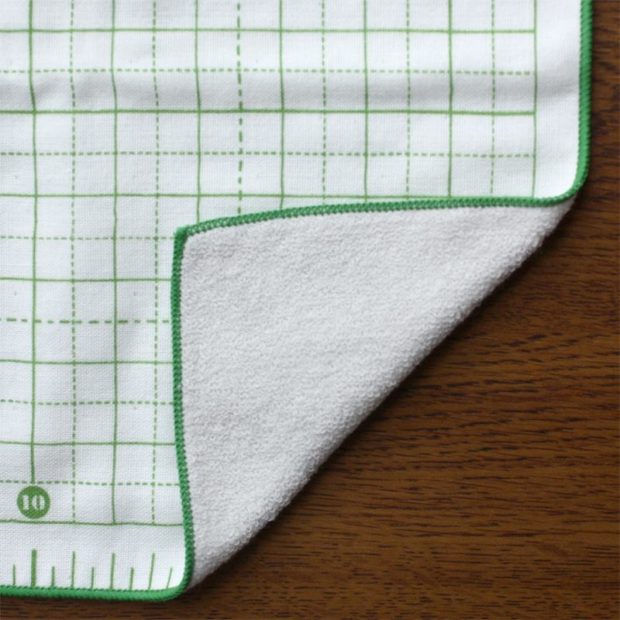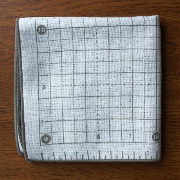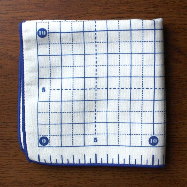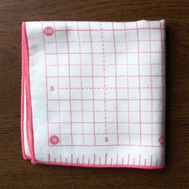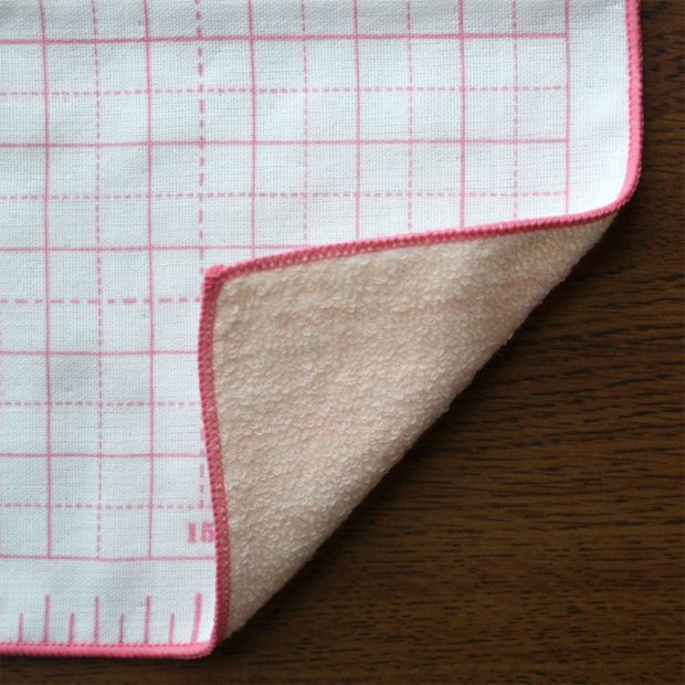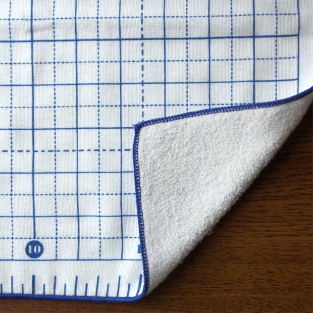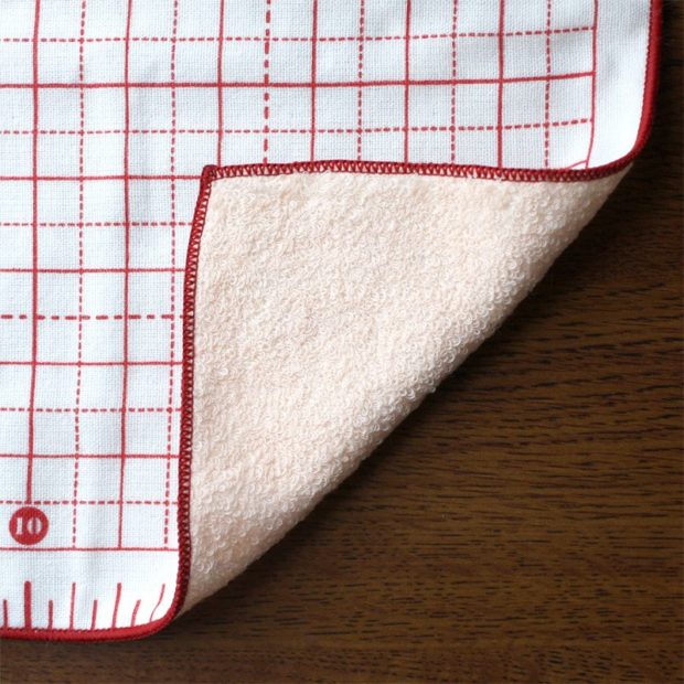 このメジャーハンカチは表がガーゼ地、裏はタオルのようなパイル地のハンカチです。ハンカチというよりはタオルハンカチという方がイメージしやすいかもしれません。ガーゼ地の表側に約1㎝の方眼がプリントされています。約22cmまで”だいたい測れる”ようです。