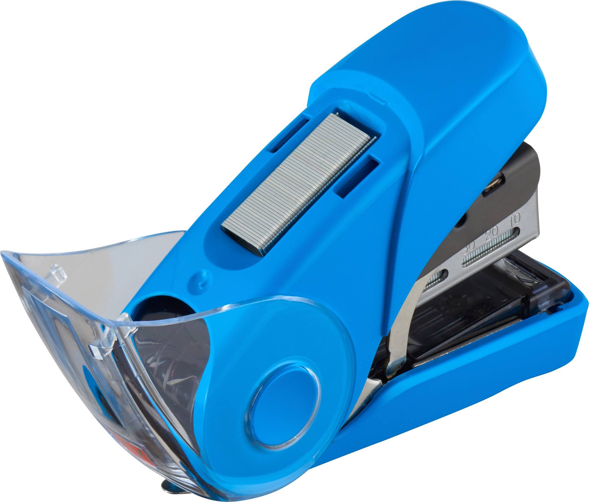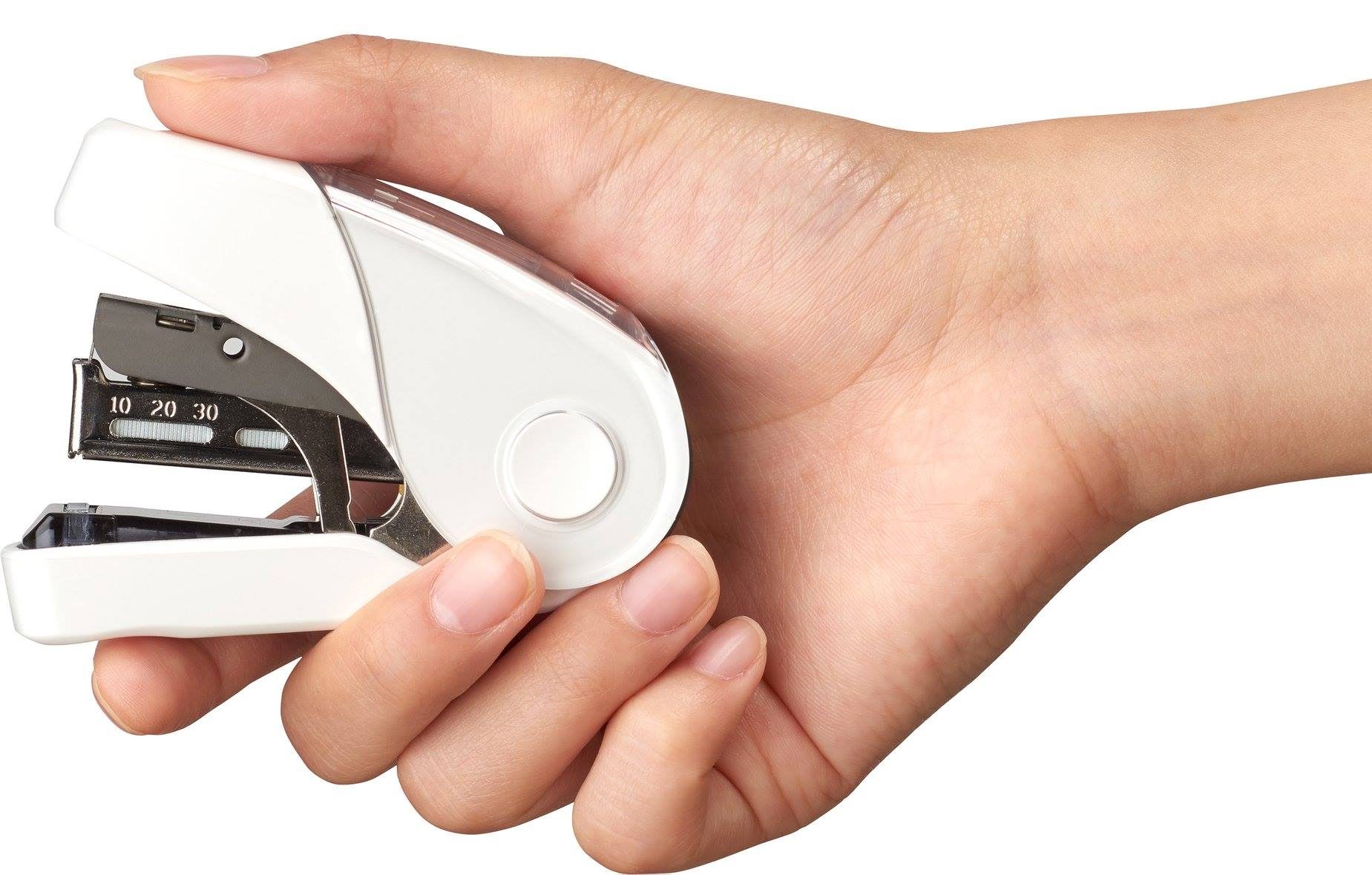 初めてサクリフラットでホッチキスを綴じた同僚はたいていその感触の軽さに驚きます。独自の軽とじ機構で綴じる力は従来品の50%と半分。2〜3枚でも軽やかに、そしてなんと最大28枚もの紙を通常の10号針で綴じる事が可能です。