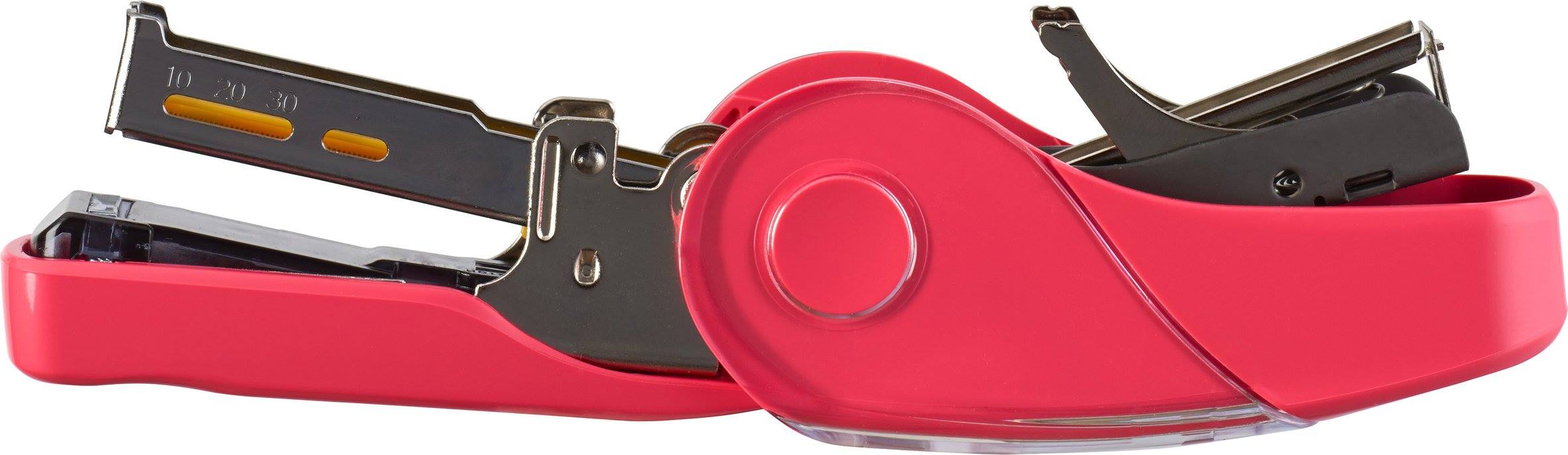突然予期せずやって来るアイツ。そう、ホッチキスの針切れです。軽快に書類を綴じていると、肩透かしを食らったような感覚で手元が「カスン・・・。」自分のデスクであればすぐに針の補充ができますが、倉庫や会議室や販売の現場などデスクから離れたところで針切れに出くわすと絶望的な気持ちになります。でもサクリフラットなら予備の針をなんと100本も装着できるポケット(ストッカ)が付いていますので、いざというときにはこの予備の針を本体に装填すればOK。私はデスクに戻ったら予備ポケットに針を補充するようにしていますのでサクリフラットを使うようになってからは針切れに困ったことはありません。何度もピンチを救ってもらいました。