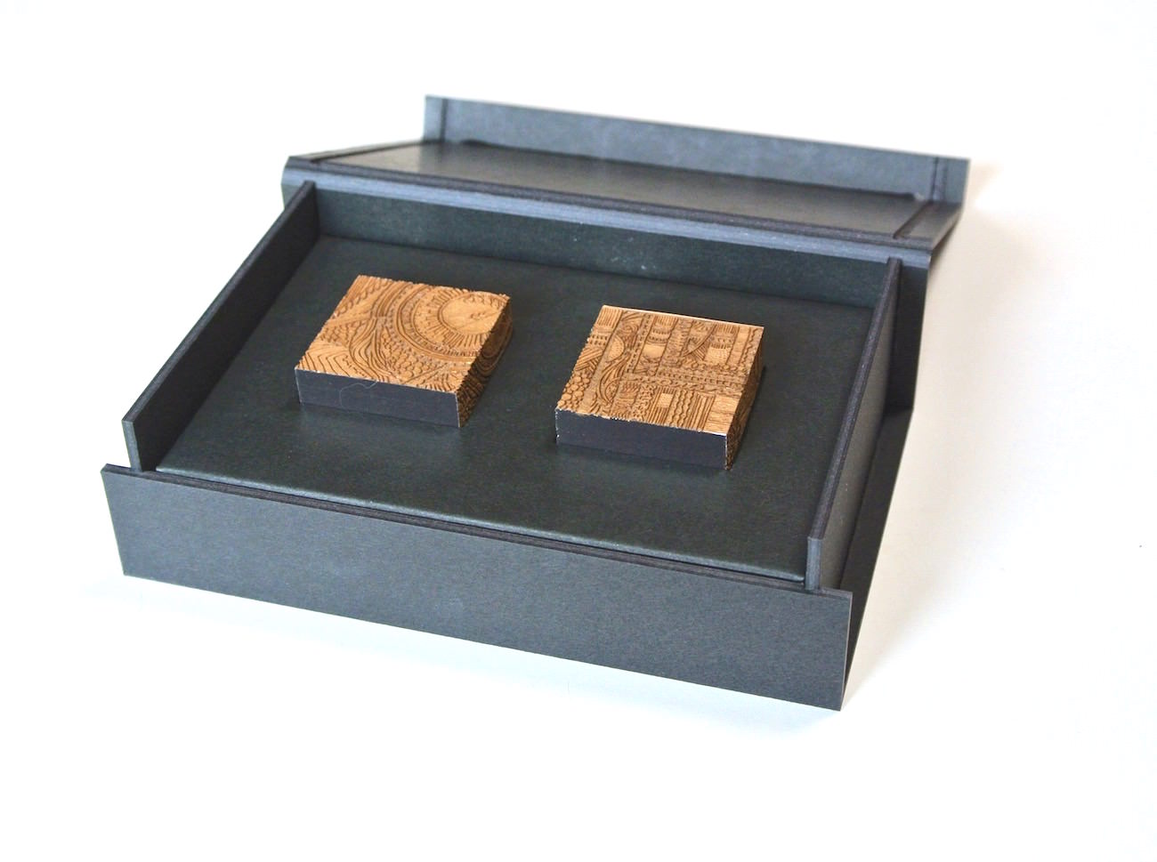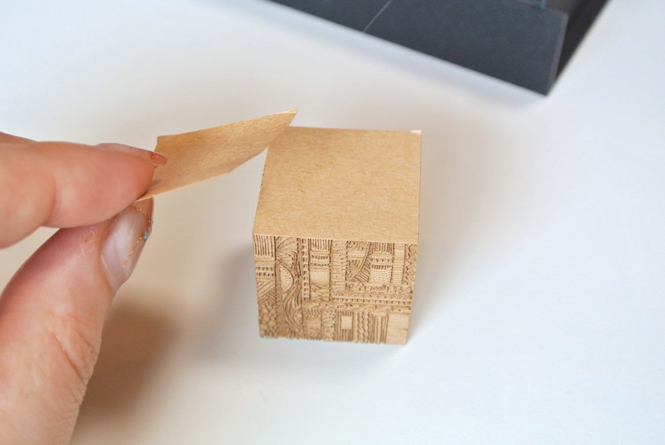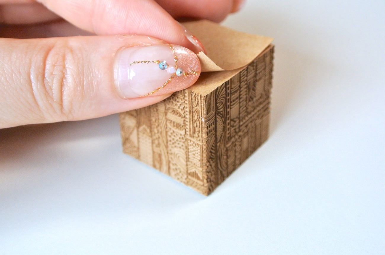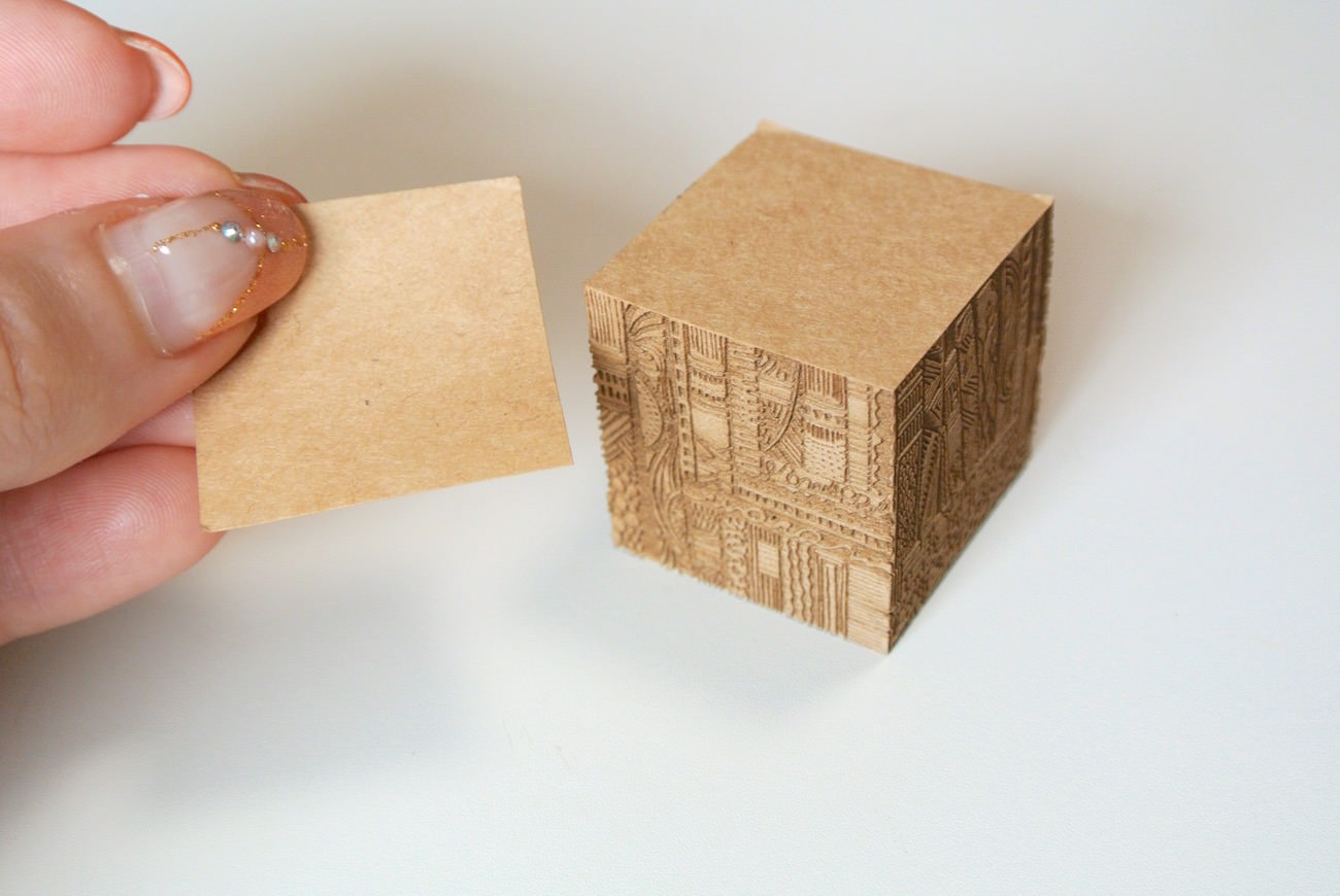 断面の細かな模様は、印刷ではなくレーザーカッターで彫り込まれたもの。彫刻の溝の深さは1mmにも満たないのですが、断面に触れてみるとしっかりと凹凸を感じられます。