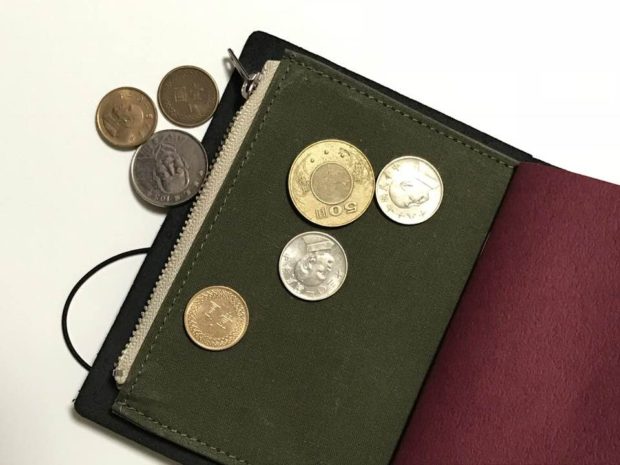 いつもは小さな財布を使うことが多いのですが、今回の旅ではジッパーケースを装着したパスポートサイズのトラベラーズノートを財布の代わりしてみました。