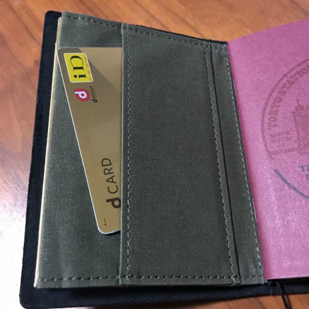 そしてポケットになっているところにはクレジットカードを入れてました。(ポケットが外向きになっていますので落下が気になる方は封筒のケースにカードを入れると良いと思います。)